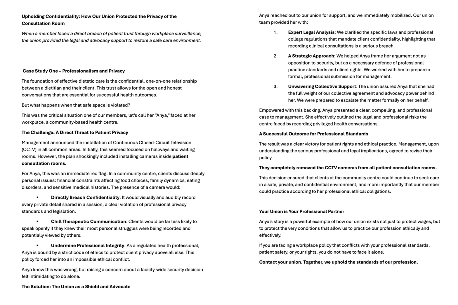 When a member faced a direct breach of patient trust through workplace surveillance, the union provided the legal and advocacy support to restore a safe care environment.